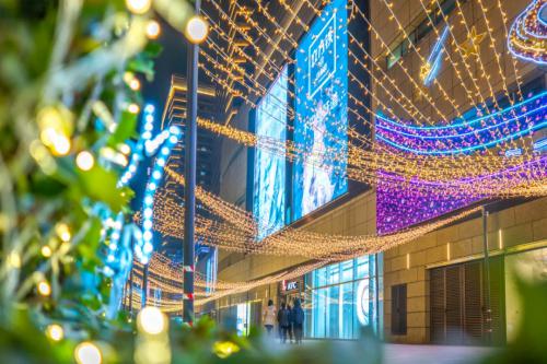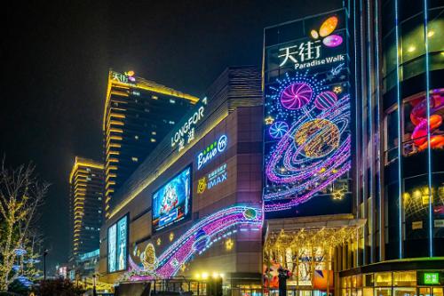 星光点缀下,龙湖上海宝山天街希望每个人都能在此寻找到爱的真谛,用爱与希望迎接即将到来的2021年新生。 漫天星帘点缀银河 在此次灯光氛围设计中,夜空彩虹设计团队结合立面的主题灯光效果,以暖白色灯帘交错横拉的设计,为龙湖上海宝山天街的通道打造了过节氛围天幕效果。