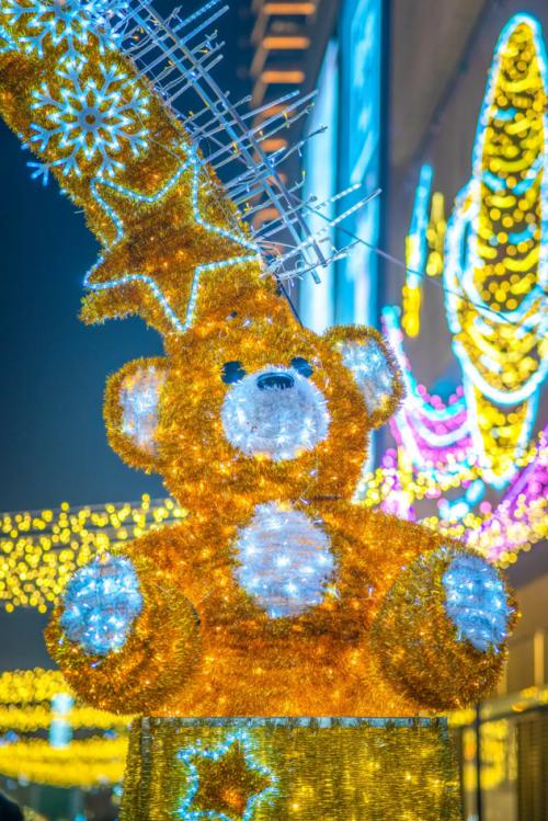 在星帘入口处,设计团队也特意设计了一对代表快乐的金色小熊迎接大家的到来。 可爱的灯光小熊以及流光溢彩的星星灯柱,吸引了不少年轻消费者拍照打卡。