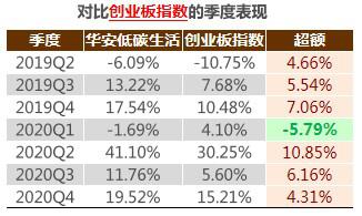 如果说渗透率决定个股的成长速度,那定价权就决定这只个股能否保持长跑不减速。 定价权的背后,是该企业对产业链的控制力、对同行的领先和创新优势、对消费者的产品定义和价格制定能力。能在技术和市场变革的浪潮中,引领行业潮流的成长股,是李欣最理想化的投资标的。 “渗透率+定价权”的投资框架,在李欣管理的【华安低碳生活】中有较为明显的体现。该基金自2019年3月成立以来,持续关注优质港股龙头,比如半导体龙头——中芯国际、华虹等,软件成长股——金山软件,移动通讯成长股——小米等,这些优质且估值较低的港股,对基金业绩的贡献明显——截至2020年末,该基金累计取得收益率131.89%(对应年化收益率59.11%)。 不光是长跑业绩亮眼,【华安低碳生活】的短跑业绩同样不俗。该基金成立以来共计7个季度,其中有5个季度取得绝对正收益;即便是对比去年A股涨幅最高的宽基指数——创业板指,【华安低碳生活】也有6/7季度的跑赢创业板指。力争每个季度都尽量不亏损或是少亏损,在此基础上每回都能跑赢市场一点点,这样投资人才更拿得住。