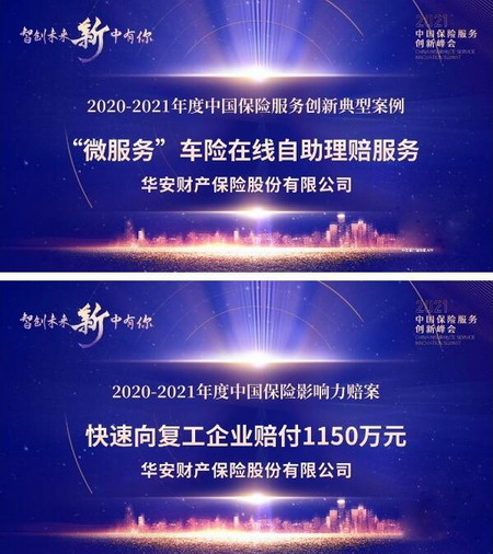 3月15日,由中国银保监会主管的唯一日报《中国银行保险报》主办的“2021中国保险业服务创新峰会”顺利召开,围绕保险消费者权益保护、保险业服务创新等方面进行深入探讨。会上,华安保险“‘微服务’车险在线自助理赔服务”入选“2020-2021年度中国保险服务创新典型案例”,“快速向复工企业赔付1150万元”赔案获评“2020-2021年度中国保险影响力赔案”。