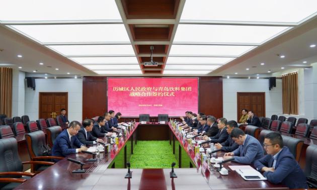 (签约仪式现场) 签约仪式上,济南历城区区委常委、常务副区长张庆国同志与青岛饮料集团副总经理、董事王少虹同志签订战略合作协议。区委书记吕涛、饮料集团董事长王达等同志共同鉴签。济南历城区政府与青岛饮料集团拟以政府资源优势和青岛饮料集团旗下食品饮料产业、品牌优势的互利互惠为基础,成立合资公司,发挥百年品牌优势,依托政府支持,深化双方合作共享、优势互补、强强联合,共同推动提升历城区高品质生活和区域经济发展。