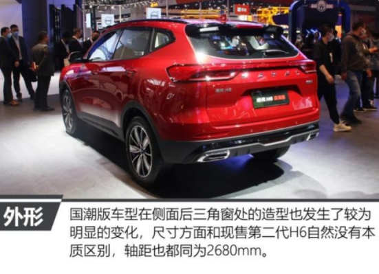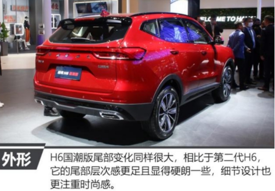 外观点评: 造型设计方面,哈弗H6国潮版参考大众消费者的审美喜好,为其引入了兼具动感与美感的SUV顶流设计新美学,前脸颇具精致感;侧面,激昂活泼;尾部立体十足,整车气宇轩昂。