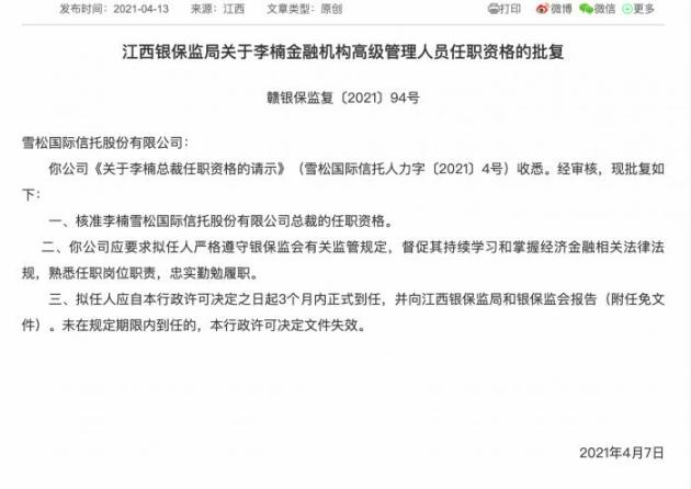 2021年4月13日,江西银保监局挂出一条批复,核准李楠担任雪松信托总裁一职,作出批复的时间为2021年4月7日。早在2021年4月9日,雪松信托官网便公告了上述批复信息。 据公开资料显示,李楠拥有20余年的金融行业从业经验,曾在太平洋保险、平安保险、诺亚财富工作多年,2013年9月开始在平安信托财富条线工作,历任佛山财富分公司总经理、成都财富分公司总经理,2016年7月加盟雪松。2019年9月,李楠出任雪松国际信托副总裁,分管财富条线工作。 中国首席商业资讯门户;更多内容请关注中国商业网各频道、栏目资讯。 免责声明:凡本站注明 “来自:XXX(非中国商业网)”的新闻稿件和图片作品,系本站转载自其它媒体,转载目的在于信息传递,并不代表本站赞同其观点和对其真实性负责 。 |