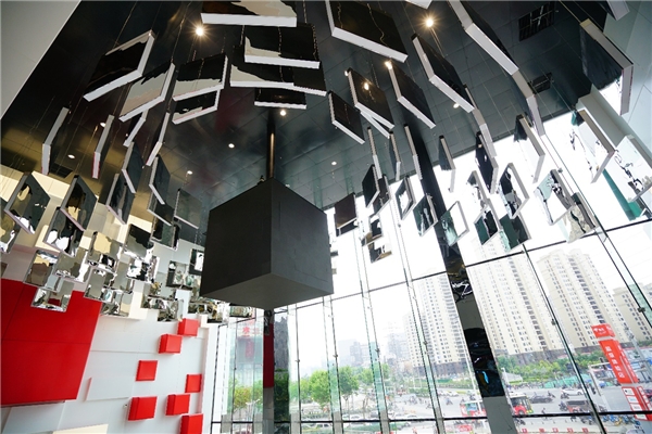 京东超体合肥店中庭场景 作为一座拥有前沿科技、以炫酷消费电子为主的大型超级商场,京东超体合肥店内还设置了许多标志性、科技感爆棚的打卡地点。如位于店内顶部的“3D超级魔方屏”装置,其可分为静态和动态两种模式,动态模式下魔方屏的五个面可进行伸缩的动作,而在静态模式下,将会有裸眼3D的呈现效果,犹如来到了未来科幻世界。