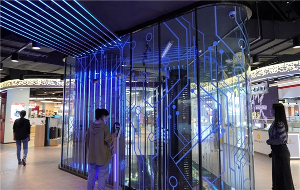 电路透明机房装置 诸如此类的打卡点在超体内还有很多,如电路透明机房、全息投影、时空隧道、扭曲空间、金属IP形象等科技装置或设施。京东超体合肥店整体门店设计也极具特色,它将科技给人的“棱角感”与安徽特色的“徽风皖韵”相融合,给消费者带来亲切感的同时,又能有新鲜感,增强了用户在店内的舒适度。京东超体合肥店将成为消费者必逛、必玩、必打卡的休闲娱乐场所,也将成为合肥城市的新地标。 沉浸式购物体验,京东超体打造城市级服务特权 京东超体最大特色在于“超级体验”,不同于以往传统的卖场,京东超体在场景、体验、科技、产品、服务上都独具特色,消费者可以在这里直接体验到前沿技术和最新产品,很自然地激发顾客的消费欲望,满足逛、买、玩的不同需求。