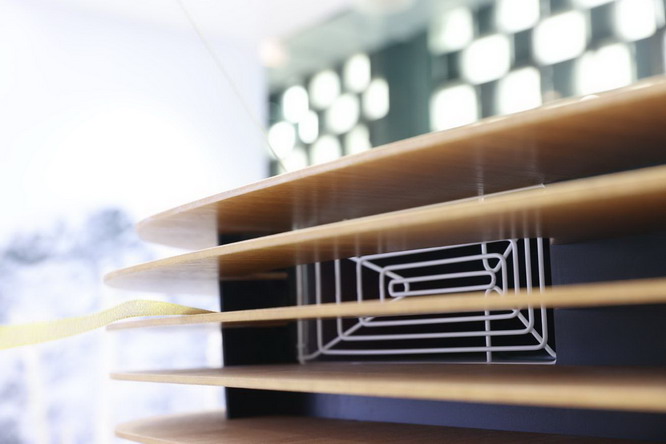 *CleanZone Sky办公场景图,采用吊顶隐藏安装 区别于IQAir 传统净化产品,CleanZone Sky 在保证多重空气净化性能的基础上,可搭配高精度空气质量监测设备,集成AirVisual Enterprise智能控制系统,有效满足办公空间对于空气净化系统的智能化管理诉求。 CleanZone Sky的另一项重要功能,是可与IQAir智能能源管理系统联动。该系统能与外部传感器结合,让产品对空气污染物和建筑空间污染水平作出动态响应,从而实现更好的节能降耗效果,帮助企业客户实现其可持续发展目标。 CleanZone Sky可实现手机端、电脑端批量设备集中控制,也可与商业楼宇自控系统数据联动,从而更好地融入楼宇智能控制系统。 3.设计灵感:云净天空,温暖自然 “设计上海”展会现场,定制款CleanZone Sky Infinity吸引了不少参观者的注意。 据Frank Hammes介绍,CleanZone Sky Infinity最初的设计灵感源自天空中翻涌飘浮的云团,之后又结合了蜂房精巧的呼吸感造型外观。机身整体运用简约弧线型灵动设计,漂浮的蜂巢造型与天然橡木饰面材质相得益彰,力求给室内空间营造温暖自然的美感。 IQAir的展会现场也结合了瑞士雪山山川绵延的形态,巧妙营造丰富的空间层次和纯净通透的空气流动感,与CleanZone Sky Infinity的设计灵感交相呼应,寓意山水尽头处坐看云起时的自在开怀,展现云净天空的清爽利落。