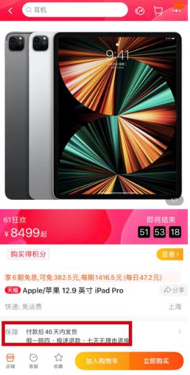 又一年618来临,苹果iPhone又成为各大电商平台的促销爆款产品,各平台纷纷表示降价促销,致使苹果的各类产品在各大平台战绩斐然!不过,618才刚刚开始,某平台却出现部分苹果产品发货周期提示为“付款后24日内发货”,不知道什么原因。 根据发货周期远远超出普遍理解的1-3天来看,在售的苹果产品,手机iPhone12在该平台似乎已出现较为严重的缺货,24天内发货的“超长待机”时长,确实挺考验用户耐心。所以,“24日”挺让人疑问的,会不会写错了?但似乎可能性不大。 由于各大平台各展实力对热销货源进行争夺,以确保货源充足,而3C产品是京东的传统优势,在一定的供货能力情况下,各大厂商一般倾向于优先保证京东的618供货。 有趣的是,在该平台上还有苹果iPad发货时间“付款后46天内发货”,这发货时间之长让人惊讶,如果按6月10日下单发货周期35天来看,大概收到货的时间为7月15日往后,618都快过去1个月了。这个发货时间让人有点晕。 买东西挺快乐,等收货太长了就不那么快乐了。 中国首席商业资讯门户;更多内容请关注中国商业网各频道、栏目资讯。 免责声明:凡本站注明 “来自:XXX(非中国商业网)”的新闻稿件和图片作品,系本站转载自其它媒体,转载目的在于信息传递,并不代表本站赞同其观点和对其真实性负责 。 |