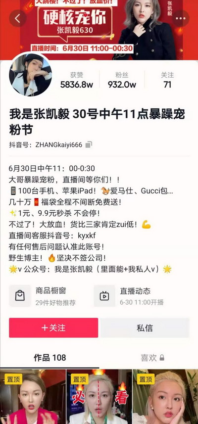 随着直播电商的迭代升级,良好的市场态势催生着垂直精细化电商主播蓬勃发展。近日,美妆达人张凯毅凭借自己对美妆产品的审慎调研和多年来的使用经验,开始尝试起直播带货,以满足众多粉丝的购物需求。由于爽朗豁达的“大哥”人设、真实负责的选品态度及其接地气的内容风格,其抖音账号“我是张凯毅”吸引了近千万粉丝的关注和支持,首战告捷也是大概率事件。 新抖显示,张凯毅在5月24日的首场直播带货中就拿下3000万+GMV的亮眼成绩,远远超出预期,经过不断地总结学习和一个月的认真筹备,她又在6月30日中午11点开启了自己在抖音电商平台的第二次直播带货,为用户带来了上百款货品,以其熟悉的面膜、彩妆、防晒、隔离、精华等美妆新潮国货为主,同时还延伸至日用、食品等品类,不仅为用户带来了极具性价比的大牌好物,还全程不间断发放福袋,在线暴躁宠粉,最终吸引1067万人观看直播,达成6037万GMV。 赠送2年面膜使用量,“大哥”张凯毅硬核宠粉 在6月30日的这场直播中,张凯毅带来了许多大牌好物和抽奖福利,并为粉丝争取到了较为实惠的价格,1元、9.9元秒杀更是将气氛一次次推向高潮,同时她还赠送给粉丝2年面膜的使用量,并进行日常补水、刷酸等贴心搭配。配合她那说话开门见山、单刀直入的“暴躁”个性,偶尔飙出的东北话以及欢快的直播节奏,吸引了无数网友驻足围观。 不过,别看“大哥”在直播间风风火火,咋咋呼呼,其实所有能够在她直播间出现的商品背后都有其细腻缜密的选品逻辑,仅在产品调研上就将其拆分为产品背书、产品使用、产品口碑、产品包装及性价比等多个维度。她会认真给粉丝分析大牌好物的特点,介绍其产品成分和干货教程,同时也会为他们推荐极具性价比的新锐品牌及新潮国货,并经常分享一些日常护肤小窍门和化妆基础教程,如前段时间爆火的“无敌底妆大法”。 本着为粉丝负责、为信誉负责的态度,她会在亲身试用之后,邀请自己的粉丝团一起试用产品,多方收集意见挖掘更加适合粉丝的优价好物。考虑到用户中孕妇和学生党的敏感肤质,张凯毅还会去请科研人员专门筛选产品成分、学习相关教程,再用通俗易懂的语言为粉丝带来解析。正是因为她那直爽暴躁的性格和真实不做作的风格,被粉丝冠以“大哥”名号,并愿意主动购买其所推荐货品,很多商品刚一上架就被抢售一空。 10.6万盒面膜售罄,张凯毅再添“面膜一姐”新昵称 在这次直播带货中,鲜明的个人特色使得张凯毅在和直播间的观众互动期间爆梗不断,其中一款面膜售罄更是被粉丝狂刷“面膜一姐”,这也是张凯毅自“大哥”名号之后获得的新昵称。作为美妆领域强势崛起的博主,张凯毅始终把粉丝当作朋友一样看待,会真正设身处地地为用户考量,避免他们踩坑,同时也将更多兴趣相同的人粘合到一起,分享日常美妆、护肤心得。