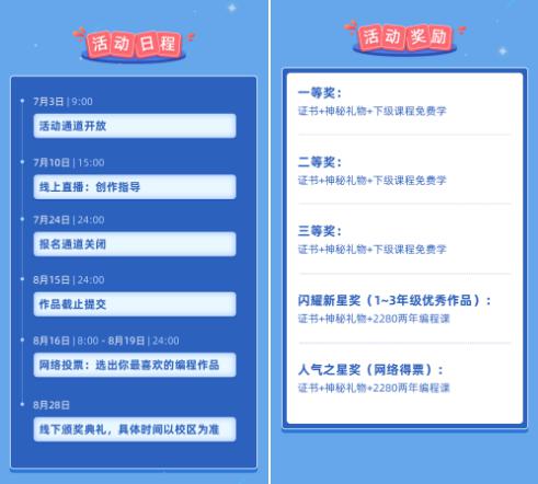 2021年7月3日,易编玩第一届“脑动秀”线上创意编程活动正式开启,为各位家长和小朋友带来一场全新有趣的暑期活动! 据了解,本次“脑动秀”线上编程活动历经3年沉淀,旨在激发孩子们对电脑编程的兴趣与热爱,从中获得更多的想法与编程技能,引导和培养孩子勇于尝试,积极探索,释放每一个孩子的想象力与创造力。 “脑动秀”采用线上参与的方式,活动时间为2021.07.03—2021.08.28。目前,报名通道已开启,登陆官网下载编程客户端,进入活动报名页面,点击报名按钮,即可注册参加。本次活动不限制编程学习背景,全国范围内6—12岁的少儿均可参加,初学者也可以展示创意。 活动包含“限时挑战”与“自由创作”两大板块。其中限时挑战板块形式新颖,可以快速检验学习成果;自由创作在“限时挑战”完成后开放,能够让孩子在创作中表达自我,体验编程的乐趣。 作品类别包含以下形式:1)互动游戏:竞技类、冒险类、休闲类、角色扮演类、音乐类、棋牌类、球类等;2)实用工具:有实用价值、能解决学习生活中的实际问题的程序工具;3)科学教育:数学研究、科学演示、英语学习、诗歌展示、头脑训练等各学科的趣味性展示与探究;4)互动艺术:引入绘画、录音、摄影等多媒体手段,实现音乐、美术等方面的创意展示。 活动结束后,小选手的亲友们可以通过网络投票的方式选出最喜欢的作品,进而筛选出一、二、三等奖以及最受欢迎和闪耀新星奖,小选手和家长可将作品分享给亲友拉票,鼓励每一位孩子的创意。 值得注意的是,该次线上创意编程活动并不限制编程学习背景,初学者也可以展示创意和想法,并通过拉动身边亲友投票,鼓励每一位孩子展示创意,让孩子在创作中表达自我,体验编程的乐趣。 作为爱贝教育旗下的少儿编程学习平台,易编玩为了给全国有创意、有想法的孩子一个相互学习、拓展见识、同台竞技、展示自我的平台,秉承着“让创新成为每个人的力量”的理念,通过丰富有趣的原创IP与动画剧情、有效的学习体系与教学方法,帮助孩子成为具有创新精神和创造力的未来之才。 未来面对的挑战,不在于时代的发展与变换,更在于以怎样的能力改变世界。越是挑战向前,越是在成长路上自信掌控精彩人生。易编玩致力于打造 3-12 岁思维启蒙与少儿编程双赛道的学习平台,立足素质教育,遵循孩子发展规律,帮助孩子实现逻辑思维能力的全面提升 。