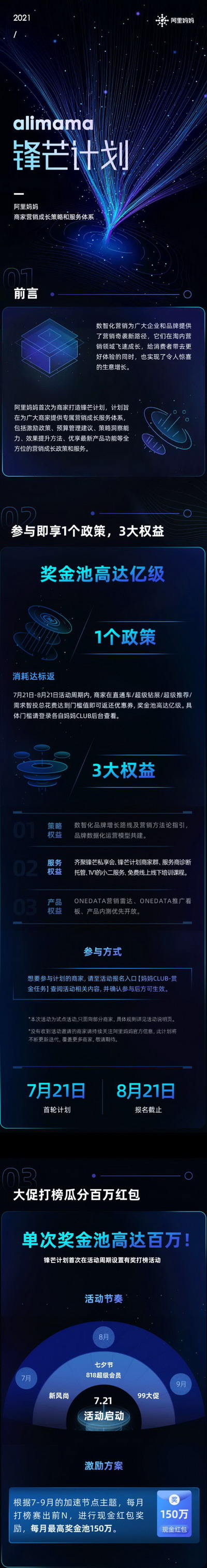 阿里妈妈合作商家的重大利好来了!阿里妈妈为商家打造的锋芒计划正式启动特邀商家试点报名! 锋芒计划旨在为广大商家提供专属营销成长服务体系,包括激励政策、预算管理建议、策略洞察能力、效果提升方法、优享最新产品功能等全方位的营销成长政策和服务。 阿里妈妈之所以升级商家服务体系,是因为数智化营销为新兴企业和新锐品牌提供了营销奇袭新路径,它们在淘内营销领域飞速成长,给消费者带去更好体验的同时,也实现了令人惊喜的生意增长。在这样的态势之下,平台赋能商家将产生巨大价值,和广大商家更好地实现共赢。 为此,参与锋芒计划的商家即可获得1个政策,3大权益:消耗达标返政策和策略权益、服务权益、产品权益三大权益,囊括了具体的激励措施、专属干货内容,涵盖多项特色服务内容及产品专属权益。活动力度空前,阿里妈妈为首批参与商家提供了亿级的激励奖金池。 锋芒计划目前处于试点阶段,参与方式为邀约制,报名时间为7月21日00:00:00~8月21日23:59:59,活动周期从7月1日延续至12月31日,商家在淘宝/天猫直通车、超级钻展、超级推荐、需求智投总花费达到门槛值即可返还优惠券。 除此以外,锋芒计划首次在活动周期结合大促设置有奖打榜营销加速活动,每月打榜赛出前 N,进行现金红包奖励,每月最高奖金池150万。 想要参与活动的商家,请至活动报名入口【妈妈 CLUB-赏金任务】查阅活动相关内容,并确认参与后方可生效。