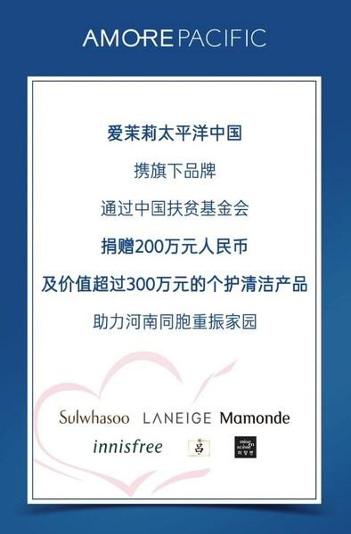 爱茉莉太平洋携旗下雪花秀、兰芝、梦妆、悦诗风吟、吕及魅尚萱等品牌通过中国扶贫基金会捐赠200万元人民币及价值超过300万元的个护清洁产品,用于支援河南灾后重建工作,助力河南同胞渡过难关。