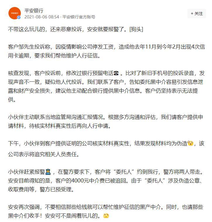 “信用修复”作为一条黑色产业链正在形成。 打开网站,输入“信用修复”词条,诸多披着答疑的广告就跳了出来。既然有人搜索,这其中就有“商机”,就会有“上钩的鱼”。 最近,平安银行信用卡就发生了两起负债人委托中介的恶意投诉事件。投诉之下,是客户的财产安全被挟裹,正岌岌可危,随时会酿成一场悲剧。 一、黑中介伪造公章被抓,违约客户“偷鸡不成蚀把米” 8月6日,平安银行今日头条号发布一条讯息,客户信用卡逾期后,找黑中介恶意投诉银行。因“黑中介”涉嫌伪造公章和材料,平安银行信用卡已报警,警方将当事人带走。 事情是这样的。起初,平安信用卡接到一起投诉电话,投诉客户邹先生称,由于疫情影响,公司停发工资,这直接导致4次信用卡逾期,给他个人造成了严重的征信影响,他要求维护人行征信。 不查不知道,一查吓一跳。经过核查,平安信用卡发现,该客户修改过银行预留的电话,通过对比新旧手机号的投诉录音,发现声音不一致,疑似是他人代投诉。 平安信用卡马上联系该客户,告知他委托黑中介容易引发信息泄露和财产安全损失,建议主动配合银行提供黑中介相关信息,但遭拒绝。 不气馁的平安信用卡工作人员马上联系当地监管局沟通汇报相关情况,通过多方沟通和评估,最终该客户同意并提供了申请材料。但是在核实的过程中,平安信用卡发现证明材料均系伪造。平安信用卡赶紧报警,客户与“委托人”均被警方带走。最终,客户支付的4000元中介费被如数追回,“委托人”则因为涉及伪造公章、收取费用等问题,警方已预受理。 无独有偶。在8月初,平安信用卡还接到了两位客户的投诉,都有难以言说的“客观特殊原因”,导致发生逾期还款,两人还“默契”地提供了“证明材料”。但是经过确认,两人都是“购买”了代投诉中介提供的“代投诉服务”,所提供的法律文书也都是伪造的。 平安银行信用卡中心成功拦截,并且向当地公安机关报案。目前,这些案件正在侦查中。 而这只是冰山一角。 近年来,“代理处置信用卡债务”等恶意投诉事件频发,甚至已形成“黑色产业链”。在这群接连上当受骗的人中,多的是被蒙蔽双眼的人,多的是不懂法之人。 与其他的恶性犯罪行为不同的是,信用卡诈骗罪的立案都是基于银行的报案。银行一旦报案,客户的违法行为必然会遭到追究。 二、无利不起早的鸟,无处不在 征信作为个人的“经济身份证”,影响买房贷款,重要性不言而喻。征信有“污点”想要“修复”的大有人在,不少违规的征信“修复”机构应运而生。这些机构烧钱投广告,等“鱼”上钩。 市场需求以及无孔不入的夸张广告语加速了这一黑产的野蛮生长,“只需3步,轻松解决逾期问题”“逾期债务问题,我们做你坚强后盾”等充满诱惑力的字眼和链接引诱用户点击。 用户根据页面提示填写个人信息后,接踵而至的就是沟通解决方案的电话。在对方的循循善诱下,一步步被牵着鼻子走,一步步掉入提前设好的陷阱。 例如,一些人被“3000元修复一条征信污点”的广告吸引而去,然后缴纳数万元的独家代理费,签订承诺修复合同,傻傻坐等征信恢复如初,却对于背后隐藏的风险浑然不知。 1、造成了消费者的财产损失 据了解,黑产中介一般抽取10%—70%不等的佣金,且在服务前,消费者需交纳5%—20%不等的定金,如中途取消服务,定金不予退还。 2020年,杭州的吴女士在缴纳900多元的定金后,黑产中介将其拉黑,因其金额过小,且无中介具体信息,吴女士只能为自己一时的贪念买单。 2、危害消费者的征信 2019年,广西的陈某通过建设银行信用卡贷款十万,由于生意亏损,还款五万,剩下五万已逾期一年,利息达9000多元。在一次偶然中,陈某联系上了反催黑产中介,并在其以30%的佣金帮他解决利息问题的诱惑之下欣然接受交易。 在中介的怂恿和教唆之下,陈某伪造伤残证明向银行申请停息挂账。最终银行取证陈某伪造证明,不仅拒绝其诉求,还有可能将他纳入失信名单。 3、导致个人信息泄露 办理相关业务,需要提交个人信息,甚至还有钓鱼网站,专门收集信息,用于售卖等,这对于个人信息安全都造成了极大的不利影响。 4 、深陷套路贷险境 协助借款人制造虚假证明达到减免利息的目的后,以借款人向金融机构提供虚假资料为凭据 ,要挟借款人运用他们引荐的套路贷产品。 一份份伪造证明、一个个委托电话前赴后继奔向银行,庆幸的是,大多数最终倒在银行的灵敏嗅觉与警方的雷霆出击之下。 及时的“扼杀”,让悲剧“夭折”。 三、诚信是根本,人无信则不立 那么,征信有污点,真的可以修复吗? 首先,可以肯定的是,征信信息如有错误或遗漏,可通过合法合规途径办理异议申请,不良信用记录“铲单”是骗局。 对于已经产生的不良信用记录,根据《征信业管理条例》第十六条规定“征信机构对个人不良信息的保存期限,自不良行为或者事件终止之日起为5年;超过5年的,应当予以删除”。 也就是从还清欠款之日起,五年之后,不良信用记录会自动消除。同时,还清欠款后应按时足额还款,重建个人信用记录,才是真正的“征信修复”。 此外,需提醒持卡人的是,目前征信记录报告会展示银行账户最近24个月的还款记录,因此建议持卡人还清欠款后继续使用该卡,24个月后,信用报告里虽然仍有不良记录,但也积累了24个月按时还款的记录,可供银行审贷参考。 人们深