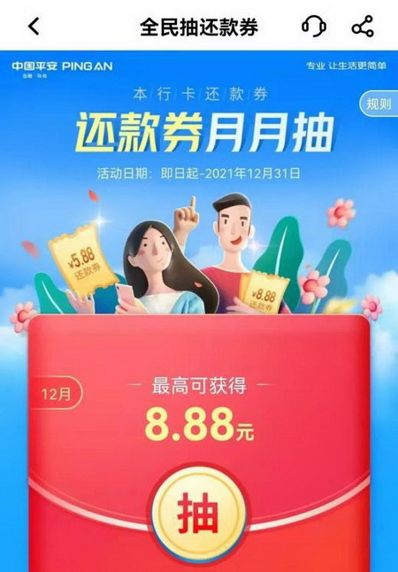 从双11积攒到现在,大家现在就可以先去平安口袋银行APP看看,你积攒了多少体验金了?活动入口:平安口袋银行APP-搜索“惠花会赚”即可进入活动页面。 其他活动 还有几个活动,可以叠加参与,充分享受优惠。 1、还款券月月抽 打开平安口袋银行APP,直接搜索“还款券月月抽”或者在“一键还款”页面点击全民抽奖的小横幅,就能看到抽还款券的活动了。 无门槛、直接抽,每人每月一次,抽到的还款券可以无门槛直接还信用卡用掉,赶紧去试试手气吧,最高中8.88元。