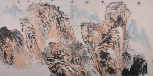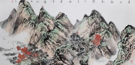 杨建军《青山图》 数十年来,着力通过山水画来表现中华民族自强不息的崇高品格和勇往直前的时代精神。他的画气象博大,豪迈豁达,可从中读出气象昂扬的当代中国精神。在几十年的探索中,杨建军游遍名山大川,然而他绘画的取材更集中于北方山水。尤以燕山、太行为重点。