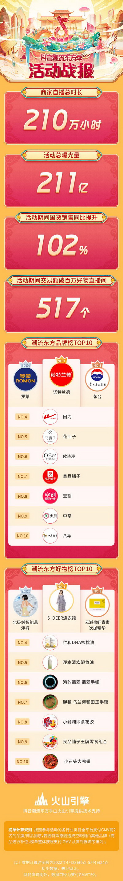 活动期间,抖音电商通过短视频激励、直播间多元玩法、店铺装修助力、抖音支付优惠等特色玩法,满足消费者在衣食住行各方面的购物需求,以国风激发多行业潜能,沉淀消费心智,助力多行业实现从“走红”到“长红”的跨越。 一、直播间+短视频+特色玩法熔于一炉,平台聚力,推国风之“帆”加速前行 回顾本次#抖音潮流东方季,活动总曝光量超211亿,商家自播总时长210万小时,活动期间国货销售同比提升102%。其中,酒/滋补行业的诺特兰德、茅台,服饰领域的罗蒙、回力,美妆领域的花西子、欧诗漫,食品饮料行业的良品铺子、空刻,以及珠宝文玩的中茶、八马等品牌均业绩亮眼。高速增长的背后,是抖音电商面向多个行业,提供了覆盖短视频、直播间的激励玩法,和各类有特色的其他玩法。 在短视频激励方面,平台激励服饰鞋包、美妆、珠宝文玩、食品饮料、酒滋补保健五个行业商家、达人发布优质短视频,赢取平台流量。除了主活动话题#抖音潮流东方季,每个行业设不同热点话题,便于用户分类型创作,获得分级奖励。此外,平台还设置了Top50短视频挑战赛,给予表现优异的短视频创作者随心推优惠券。 活动期间,热点话题#你永远可以相信华流 跻入抖音话题总榜TOP 5;珠宝行业热点#这是我最pick的国风文化 进入短视频挑战榜单TOP 6;美妆行业热点#凤凰妆 更是成功进入抖音话题总榜TOP 1。