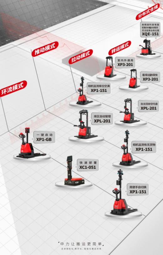 (空中相机识别库位空满状态,通过列管理,根据仓库运输需求,推动货物到各个终点) 4、转运模式 可以实现物料跨厂区、室内外的转运。 这一模式解决的是“原料从卡车卸货到仓库,从仓库把成品送到卡车”的生产线最两端的物流搬运需求。 此模式的完成要求产品可以实现室内外搬运的切换,穿梭在不同的建筑物之间,要适用于全天候,无论是室外下雨,还是晴天都不影响工作;适用于全天时,不受白天晚上光线的影响;适用于全场景,不用担心路面状况不好,斜坡上不去;要具备超高的安全性,可实现人机混场共用。 中力基于传统叉车的优势打造了该模式下专业的智能机器人,实现了两端的无人化和智能化。 该模式下的定制化产品XP3、XQS,利用自主研发的“呼叫系统、空中相机、视觉激光”等技术可实现穿梭于不同的建筑物之间,可适应室内外天气的变化,光线的变化,可快速适应场景的变换,且具备自动绕障功能,可人机混场安全作业,达到“人机合一”的高效作业。 5、分布式仓储模式 以标准料架为载体,机器人实现自动堆垛,通过空中相机进行仓储空位管理,实现车间在仓库、仓库在车间的分布式仓储,彻底改变原始的仓库货架模式。 传统工业制造业最具普通性的存储方式一般采用“人+货物”的形式,传统制造业由于货物的复杂性而制约性很强,弊端明显。 ①货物的管理难度大:要实现货物的管理必须统一货架,集中管理,减少仓储成本,但同时也增加了管理难度,物料的转运、物料的存储、物料的新旧替换、物料的先进先出、物料的装卸等等都难以及时、高效的配合生产节奏。 ②人工成本增加:传统的管理模式人力资源冗余无法消除,容易造成决策错误,补货不及时造成交付延误的情况,制约生产效率。 ③仓储效率降低:为减少仓储面积而增加堆垛高度,高位堆垛的取放货导致搬运效率降低。 针对传统仓储方式,中力推出“分布式仓储”模式,以标准料架为载体,搬马机器人自动堆垛,实现车间-仓库、仓库-车间、仓库内部的分布式模式,彻底改变传统的货架存储方式。