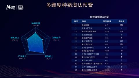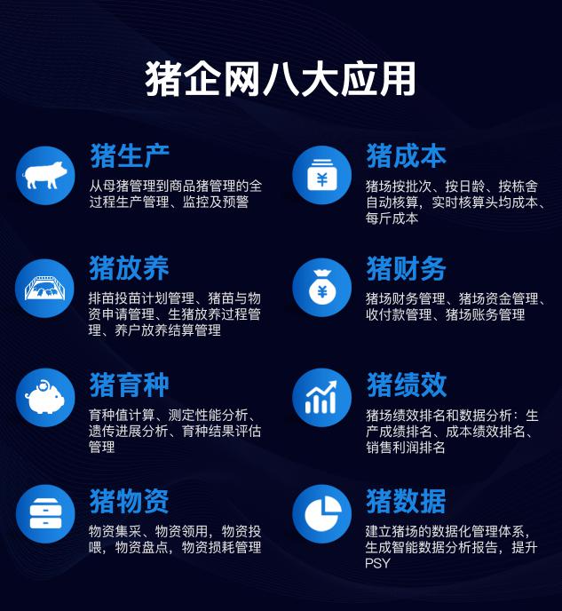 提供猪生产、猪放养、猪育种、猪物资、猪成本、猪财务、猪绩效、猪数据八大服务,实现线上化、数字化、智慧化管理,提升猪场的管理效率。猪场批次化管理有效提升猪场防疫水平和绩效管理效率;任务驱动的过程管理实现多屏数据同步,随时随地查看猪场情况;多维度种猪淘汰预警基于多维度种猪主动淘汰预警模型,综合种猪发情能力、受孕能力、产仔能力等14种淘汰指标,帮助猪场淘汰低效、低能母猪,提升猪场的生产水平。