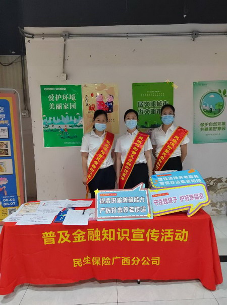民生保险广西分公司结合自身实际开展户外宣传,在沿地铁商业街、公园等人员聚集场所开展“普及金融知识守住‘钱袋子’防范养老诈骗”户外宣传活动,通过设置宣传咨询台,现场发放各类宣传折页、向社会公众尤其是老年人、新市民、青少年群体普及金融知识,教育人民群众主动防范风险,打击养老诈骗,持续扩大广大群众掌握必要的金融知识与技能,引导群众牢固树立风险防范意识,共同守护幸福生活。