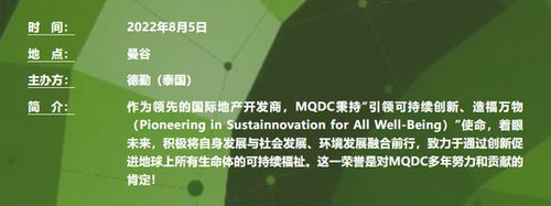 “荣获‘2022年泰国卓越管理公司’奖项,进一步坚定了MQDC所有成员推动公司‘可持续创新发展’的决心和信心。在开发项目时,严格遵循MQDC有关造福身体、精神和环境等方面的标准,保护当地生态系统。此外,为了真正实现以可持续发展引领品质生活 ,MQDC还支持研究和创新。目前,MQDC已建立了研发中心,致力于以创新研发推动并实现可持续生活。这些研发中心不仅有助于解决社会环境挑战,提高生活质量,还通过开展多元化活动,鼓励引导MQDC旗下项目居民参与社区共建共治。”Visit Malaisirirat先生还表示。
