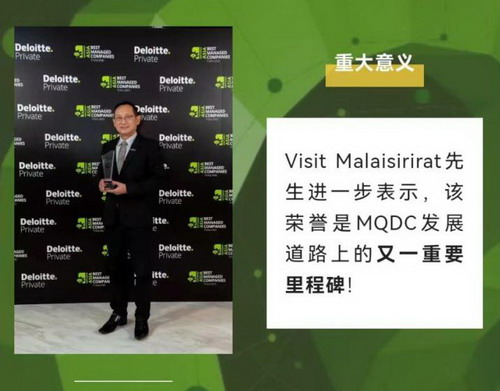 MQDC首席执行官Visit Malaisirirat先生表示,MQDC很高兴也很荣幸能够获得全球顶级咨询公司德勤颁发的“卓越管理公司”奖项。该荣誉体现了MQDC在围绕愿景和使命,坚持道德经营,以良好的公司治理和健全的财务管理为抓手,迈向可持续成功方面取得的卓越成就。