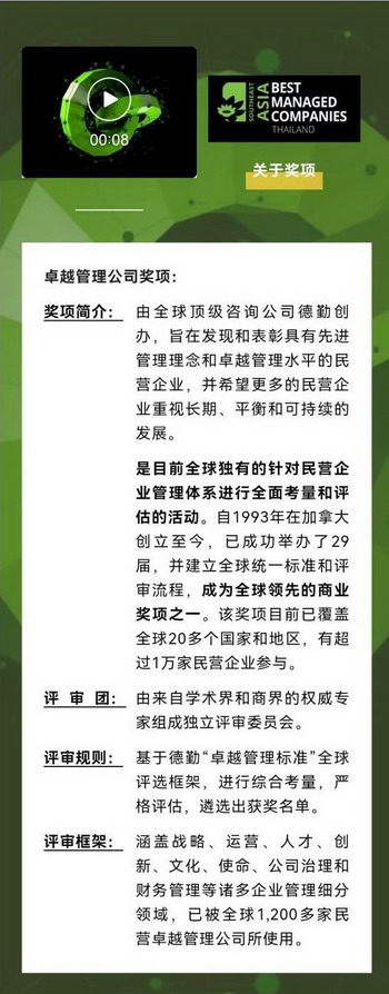 德勤泰国管理合伙人Subhasakdi Krishnamra先生表示:“‘卓越管理公司奖’不仅是对民营企业的表彰,还为它们提供了一个展现成就、表现自我的绝佳机会。从获奖者身上,可以感受到它们展现出来的果断、创新和能力,不仅均走在行业发展前沿,还是发展成为公认的国民品牌乃至国际品牌的制胜法宝。作为各自领域的领导者,每一位获奖者都在与利益相关者互利共生的同时,为社区发展做出了重大贡献,它们应该为此感到自豪!祝贺所有获奖公司, 我们也很荣幸能够见证它们为所有成员、客户和社区持续贡献力量。” 关于奖项