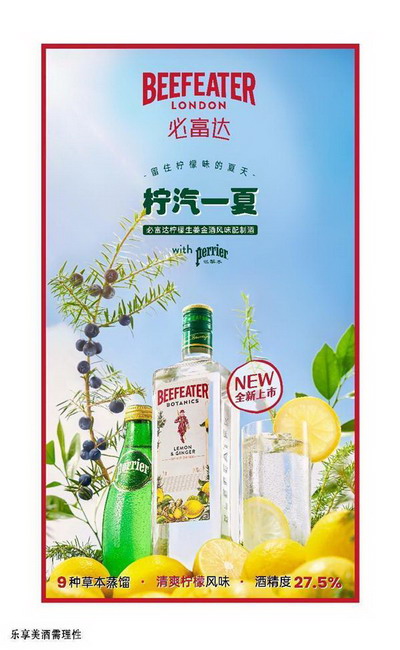 源自英国伦敦的金酒品牌Beefeater必富达,推出全新柠檬生姜金酒配制酒——“柠夏”,以品牌经典9种草本植物蒸馏,加入清爽黄柠檬风味配方,以27.5%更低酒精度并借“留住柠檬味的夏天”的品名含义,紧贴新一代消费者对都市平衡生活方式的需求,带来必富达水果金汤力等都市平衡调饮。无论是都市日常运动健身之余,或是自然户外、居家休闲、摩登欢聚,柠夏是年轻都市玩家探索自然平衡生活的陪伴。 必富达金酒更将于9月与法国高端含气天然矿泉水品牌Perrier®巴黎水灵感联动,推出“柠汽一夏”跨界合作,以更轻盈及清新的创意饮用搭配,为充满新鲜体验的城市生活打开新体验的可能。