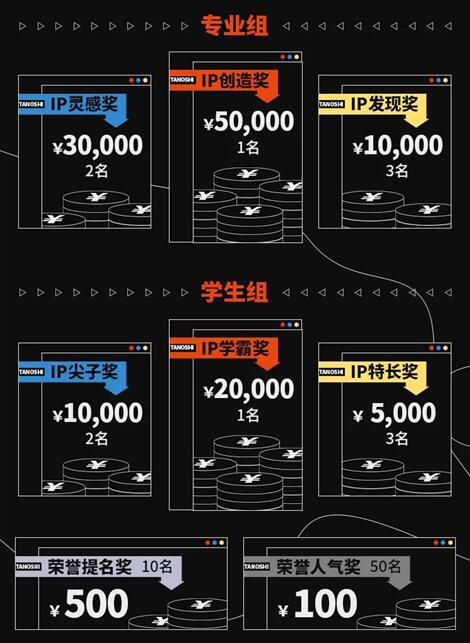 赛事总奖金20W+ 分为专业组和学生组 辐射各个年龄层和职业 让每个有设计梦的人,都有展示自己的舞台 第一名:IP创造奖/IP学霸奖 第二名:IP灵感奖/IP尖子奖 第三名:IP发现奖/IP特长奖 注:荣誉提名奖于荣誉人气奖为,未正式评选的网上投票前十名
