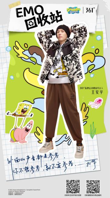 近日,361°与海绵宝宝联名发布了系列设计产品,这也是双方首度合作。该系列新品以“保持天真,快乐上身”为主题,向更多消费人群传递了海绵宝宝的乐观精神与快乐哲学。不仅如此,361°还携手品牌运动潮流代言人王安宇共同发起了「EMO回收站」活动,将跨界联名玩出了新花样。一起去街头涂个鸦,再向快乐敬个礼,上身潮流范儿,当个快乐海绵宝宝吧。 拒绝EMO,与王安宇一同快乐上身 “EMO”一词最近两年火爆全网,广大网友似乎终于找到了恰当的词语来表达情绪,如今它依然活跃在各大网络与社交圈。火热的背后反映的正是当下大众工作和生活压力激增,快乐占比下降的现状。