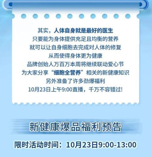 10月23日,盗龄医生爱心节,在直播间带来健康好物。并邀请品牌创始人万百万先生亲临,分享主题为“细胞全营养健康安心享”的新健康内容,和观众们一起了解细胞营养方面的知识,学习养生的科学理念。 盗龄医生品牌的创立,为健康行业注入了新鲜活力,不仅始终坚持专研各类健康好物,更传播着新健康理念,为众多消费者带来新健康的思维,推动养生计划的科学进行。随着电商直播的发展,10月以来盗龄医生在每周日也开启了直播,一方面为消费者带来优惠的健康好物,另一方面则是传播更多健康的新知识。