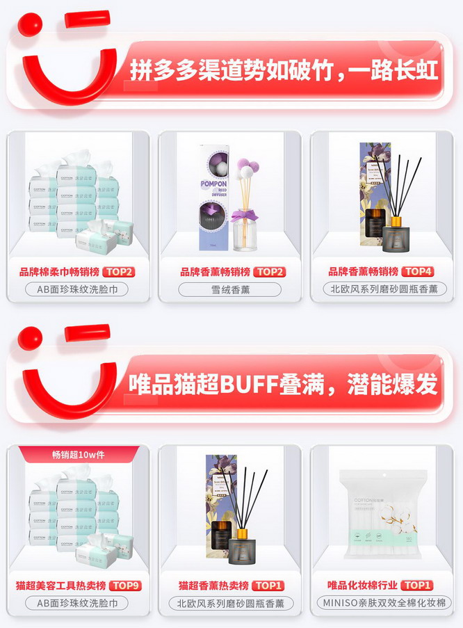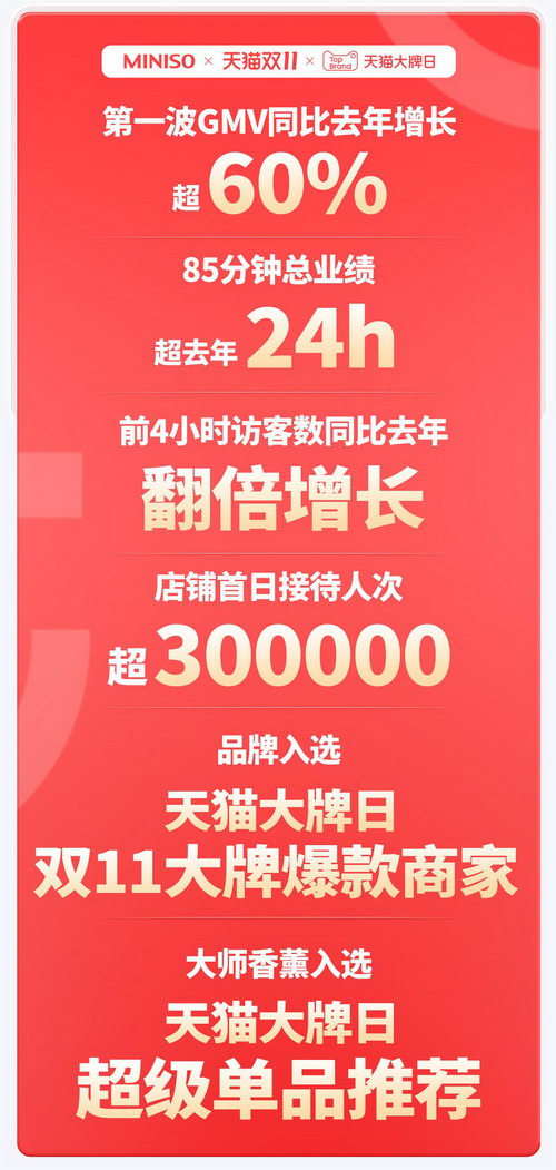 作为治愈系消费的引领者,今年双11名创优品主打“好看、好玩、好用”的治愈系好物,而这正切中了当下年轻消费者渴望解压、追求心灵放松的脉搏,押对宝的名创优品也因此赢得了产品销量的爆发式增长。 据名创优品双11开门红战报显示,在天猫渠道,名创优品第一波GMV比去年增长超60%,85分钟总业绩超去年24小时,品牌入选了天猫大牌日“双11大牌爆款商家”,大师香薰入选天猫大牌日超级单品推荐;拼多多渠道首日名创香薰品类夺得品类畅销榜单TOP1;在京东渠道,名创优品入榜平台京东新百货增速强劲趋势品牌,成交额同比增长超400%,位列京东家居日用服务好店店铺榜单NO.9;淘宝直播间GMV同比增长986%,访客同比增长148%,抖音直播间GMV同比增长68.9%。