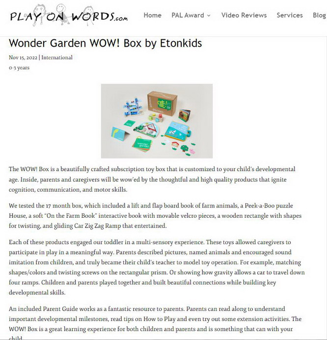 近日,由伊顿善育集团出品的“哇盒子”蒙氏家庭早教月龄盒再传捷报,荣获国际知名的“PAL AWARD(游戏促进语言学习)”大奖,又一次凭借实力收获了行业和公众的认可,充分展现出哇盒子作为国内家庭早教标杆产品的专业性。 PAL奖项创始人、CCC-SLP硕士、国际知名的语言病理学家Erika Cardamone在她15年的儿童教育工作中发现,儿童早期语言水平会直接影响他们入学后在阅读、写作和批判性思维等方面的表现,并影响情感和社会认知的发展,因此选择最佳的玩具和书籍对儿童语言的练习和发展至关重要。 为了帮助全球家长遴选出设计精美、内容充实、质量上乘、特色鲜明、通过“玩”就能促进孩子语言发展的优质玩具、游戏和书籍,PAL大奖不仅关注玩具、游戏和书籍的趣味性,更强调孩子们在获得快乐的同时应该获得与周围环境有效的互动和沟通。 凭借与PAL多项理念的“不谋而合”,哇盒子最终被授予了该奖项。 为保证PAL奖项的权威性和科学性,PAL会对每一款提名的产品进行实测,本次PAL评委会对哇盒子17月龄盒产品进行了全方位测评。评委会认为,哇盒子是一款制作精美、能给父母带来震撼的高质量月龄产品,里面的每一个玩具都能带给孩子多重感官体验,激发他们的认知、沟通和运动技能。附赠的《家长指导手册》能帮助家长了解孩子重要的发展里程碑,学会作为观察者如何和孩子有效互动。在这个过程中,不仅可以提升家庭亲子关系,还能促进孩子该成长阶段的语言发展和其他关键技能的发展。 PAL官网上对哇盒子产品的测试评价 作为蒙氏被动玩具,哇盒子设计自然、精巧,不依靠声光电等强烈刺激就能吸引孩子,17月龄盒也充分体现出这一特点。 盒子里配备了5个玩具和1本绘本,既能满足宝宝当月在感官经验、动作发展、语言沟通、认知实践、社交情感五大领域的潜能激发,也不会因为可选的玩具太多影响宝宝的专注力培养,给孩子创造出了一个蒙氏教育法所提倡的“有准备的环境”。结合孩子当月的认知水平,玩具设计中巧妙融入了蒙氏数学、英文启蒙、逻辑思维启发等益智元素,让宝宝主动探索、主动思考、主动感知,有效提高孩子的专注力和创造力。 除此之外,月龄盒里随附的家长手册可以让家长了解孩子当月重要的发展里程碑,帮助家长们更加“懂孩子”,配套的由国内外顶级育儿专家录制的早教课程还会全方位解读宝宝当月的发展特点,传授实用易操作的先进育儿方法,每节课程2-3分钟,家长只需下载哇盒子APP,就能轻松学会如何在家科学育儿。 通过“适龄玩教具+早教APP+育儿课程+家长服务”,哇盒子致力于为0-3岁家庭提供养教一体的360°全方位家庭早教服务,解决中国家庭科学育儿的多重难题,赋能每个宝贝自主成长的能力,让中国更多家庭享受优质且公平的“智慧养育”体验。 中国首席商业资讯门户;更多内容请关注中国商业网各频道、栏目资讯。 免责声明:凡未注明来自本站的稿件和图片作品,系转载自其它网站,转载目的在于信息传递,并不代表本站赞同其观点和对其真实性负责 。 |