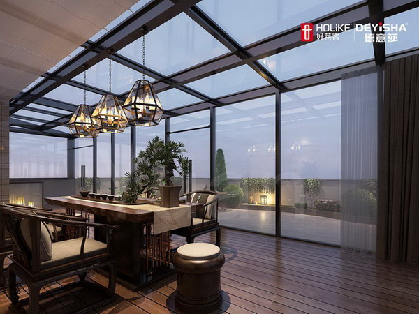 主型材采用高强度的6061-T5铝合金,在防水、防火、防雷方面都符合建筑及新能源光伏行业要求,寿命也满足建筑级寿命要求。发电光伏组件在抵挡和吸收太阳辐射的同时,还有效地解决了户外庭院夏季日晒的困扰,让阳光房真正成为人们办公室、休闲、娱乐之所。 好莱客HOLiKE门窗营销总监张伟介绍,在空间功能方面,设计方案按照办公、休闲、会议、健身房功能进行了室内装修设计,里面放置办公座椅、运动器材、茶水台、咖啡机等,十分适合员工们办公休闲健身,大大提升的空间使用率。 二、新能源发电门窗和阳光房工程概况 好莱客HOLiKE集团DEYiSHA的发电门窗和阳光房采光顶,从设计到落地总共耗时90天。由于新能源发电门窗和阳光房项目施工现场在7楼的楼顶,作业面狭小,为搭建增加了挑战性,总体施工搭建约7天。