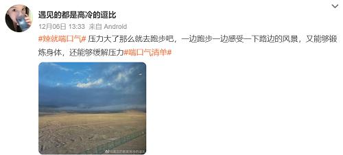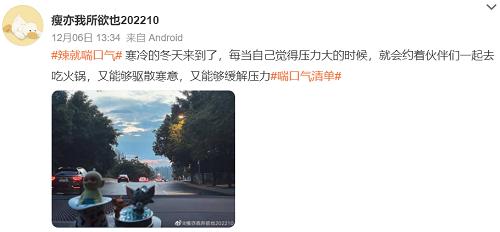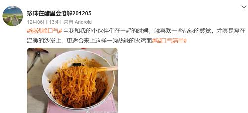短片开头,以憋气比拼的场景切入,影射了当代青年在内卷环境下被不断倒逼,不敢停下喘口气的状态。的确,职场永远完不成的工作、生活中的各种经济支出……大大小小的问题影响着年轻人群的心境情绪。压力巨大的年轻人,扛着压力不断向前,但却忘了自己还有“自由呼吸”的选择。 基于这样的人群特点,白象旗下专注于15-25岁互联网原住民的辣味速食品牌——大辣娇提出“辣就喘口气”的态度slogan,告诉大家面对不愉快的情绪,不妨喘口气休息一下。在马可婷看来,这不仅是句鼓励的话语,更包含着对身心健康的关注以及成年人懂得自洽情绪,化解困惑的能力。 白象大辣娇与同样专注年轻人群的北辰青年顺势推出“辣就喘口气”行动,策划了一场极具“治愈”感的活动。两者通过制造一个又一个的“喘口气”时刻,给年轻人们带来了情绪慰藉,也让马可婷这个「空巢青年」在难熬的年末节点获得了一丝安抚。 02 传“辣” 多线连接人群的互动沟通 在洞察消费者情绪和痛点的基础上,白象大辣娇与北辰青年通过不同形式、平台与用户搭建沟通,以话题互动和产品周边种草等方式打通传播链,实现了消费者情绪共鸣。 微博互动造势,话题渗透带动软传播 在微博端,白象大辣娇与北辰青年联合发起#辣就喘口气#话题互动,邀请人们分享自己的“特别喜欢的喘口气瞬间”。