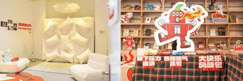 复盘白象大辣娇与北辰青年的传播策略,我们可以发现其积极开展多渠道传播,同时,在这个过程中,“解压”的情绪价值被自然嫁接到大辣娇火鸡面的“辣”属性上,人群特性与品牌产品形成了深度绑定。 03 找“辣” 沉浸式体验里的无形种草 为了提供更多缓解焦虑,柔软人心的解决方案,白象大辣娇与北辰青年携手打造了「辣就喘口气情绪SPA馆」。 走进店内,随处可见辣椒元素,轻松的玩趣氛围让人瞬间收获好心情。站在火辣萌趣的辣椒仔玩偶旁边来个合影自拍,谁还不是大片主角呢?