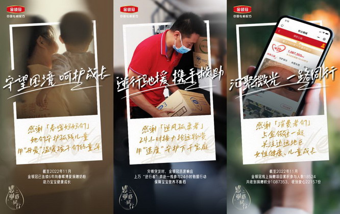 践行社会责任守护美好家园 持续关爱母婴群体健康 这一年,金领冠还在慈善公益和环保事业上不懈努力,积极推动母婴健康事业的发展,持续关爱母婴群体。 今年年初,金领冠携手中国红十字基金会,共同打造金领冠爱儿俱乐部积分商城“领冠公益”,邀请千万金领冠会员用积分奉献爱心,暖心守护贫困地区儿童的健康成长。面对灾情等突发情况,金领冠第一时间响应,线下调集物资支援疫情前线,尽己所能保障宝宝营养不断档。 在“母乳喂养促进,健康教育先行”为主题的母乳喂养周活动中,金领冠作为科学母乳喂养的倡导者和践行者,和更多妈妈站在一起“守护母乳力量”。 为了让更多的孩子可以健康成长,金领冠与北京春晖博爱公益基金会携手向春晖博爱的春晖关爱之家项目捐赠婴幼儿配方奶粉,截至2022年11月,金领冠已连续6年向春晖博爱捐赠奶粉,以“微光”照亮孩子们,帮助他们健康成长。