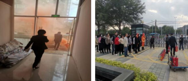 演练场地设置在保险广场门口处的安全空地。演练开始,由物业安防人员设置一个着火点,用手机模拟火灾自动报警系统的警铃声响,确认火情发生的地点。随后,应急救援小组人员到达火灾现场后立即采取就近原则进行灭火,拨打火警电话119向消防部门报警,并开展人员疏散工作。参与演练的员工及物业人员有序撤离,应急演练顺利进行。