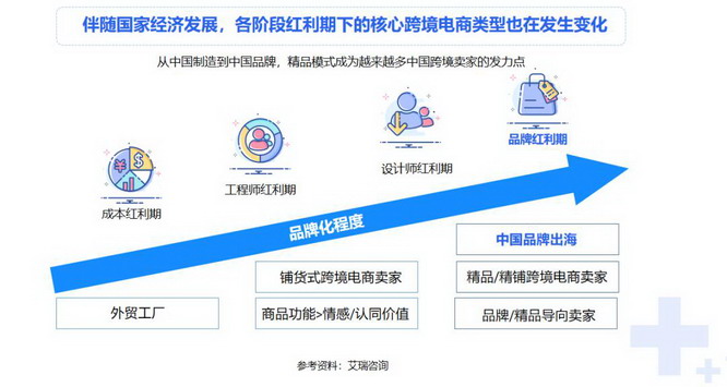 据卖家调研显示,95%的受访卖家都说“品牌打造”对他们全球业务增长至关重要。亿级卖家坚持技术创新和品牌价值打造,构建高速增长的发展模式。 一、跨境行业发展趋势 中国制造—>中国品牌 “中国制造”向“中国品牌”转变,推动着跨境电商的主流模式发生变化——铺货式卖家日渐式微,精品模式成为海外电商主流,且主导地位日益增强,得精品者得天下。同时,随着各国与电商进出口相关的法律法规不断更新和完善,当下跨境电商行业的主流——精品中大卖越来越看重出海经营的合规性,以及各个业务运作的专业性和高效性。