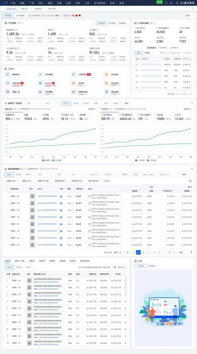 1、运营支持,修改listing,自动调价,创建FBA和CPC广告。 2、广告优化,分析单品高峰成交高峰阶段,分时调价,提升广告投放ROL 3、全局数据,核心数据瞬间get,销售和利润数据,以及核心单品表现。 4、利润分析,按照SKU、市场、店铺、产品、订单角度精细计算毛利。 5、业务协同,采购和产品部门了解销售数据,合理决策。 6、数据安全,用户的每套账户进行独立部署。