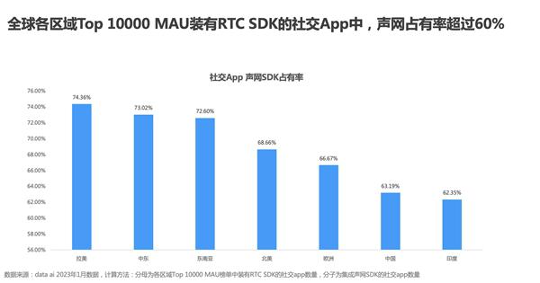 据悉,全球实时互动云服务开创者和引领者声网,于近日发布了《2023音视频社交出海白皮书》,旨在通过其在 RTE 领域的技术优势和服务能力,助力音视频社交企业更好地拓展全球市场。 根据36Kr 2022年统计的结果,在中东市场Top 100榜单中,使用RTC技术的产品占到了26款,这其中,使用声网 SDK的有19款产品,占比73%,同时包含了中国出海、美国、中东本地产品。而在全球集成了RTC SDK的App中,声网的覆盖率也高达43.2%,涵盖北亚、北美和拉美等地区,远高于全球其他服务商,约为第二名的2.5倍,包括电商、运动健身、游戏、社交等多个场景。 数据来源于data.ai(2022年1月),后经人工统计测算 就今年数据来看,使用声网作为音视频技术提供商的社交泛娱乐企业遍布全球,全球各区域Top 10000 MAU装有RTC SDK的社交App中,声网占有率均超过60%。 中国首席商业资讯门户;更多内容请关注中国商业网各频道、栏目资讯。 免责声明:凡未注明来自本站的稿件和图片作品,系转载自其它网站,转载目的在于信息传递,并不代表本站赞同其观点和对其真实性负责 。 |