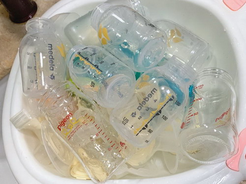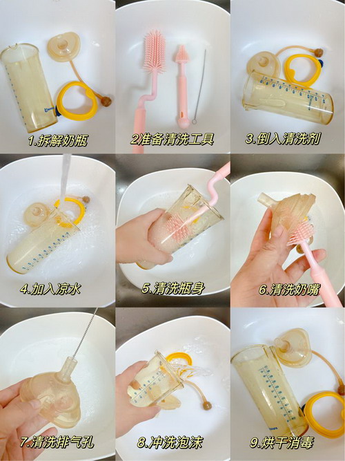 2:影响宝宝食欲奶瓶没洗干净,再加上烘干不到位的话,一打开奶瓶就会有一股很难闻的味道,会引起宝宝厌恶喝奶,尤其是在炎热的夏天!! 3:奶瓶不耐用、老化快有一些新手的家长,消毒就直接用高温煮奶瓶,温度过高反而适得其反。奶瓶大多数是硅胶材质制作而成,在高温的作用下,奶瓶中的吸管奶嘴发黄,会加速奶瓶老化; 正确洗奶瓶方法一:传统手洗1:洗净双手用洗手液/肥皂揉搓20秒后,用流动水清洗干净,并用纸巾擦干。 2:及时清洗每次喝完奶后都要及时清洗,如果有事耽搁没法充分清洗,也需先用流动水冲掉大部分奶渍。 3:拆开奶瓶浸泡将奶瓶的各部分“拆开”,奶嘴、奶瓶、奶盖,每个零部件都分开来洗;将拆开的奶瓶组件,放在加入奶瓶清洗剂的温水里浸泡几分钟。这样能充分软化瓶内的奶垢,更容易清洗;