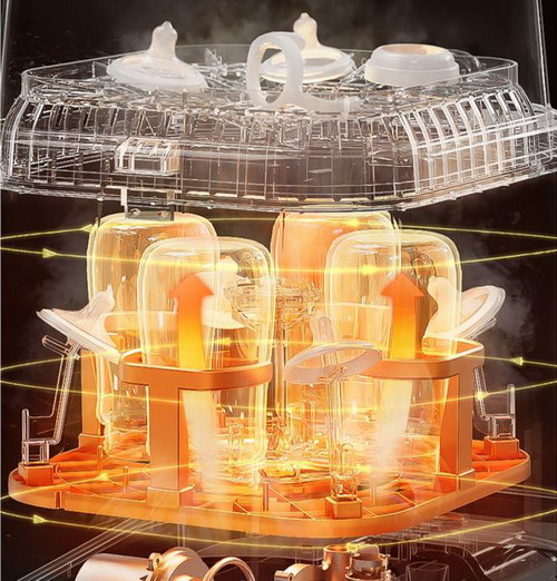 1.8Kpa高压冲洗,结合3+1组合洗涤模式,6种定制洗涤方案,照顾日常奶瓶清洗、消毒所需,针对不同使用场景游刃有余,悉心呵护宝宝用品卫生健康。上下双层置物架设计,下层可以清洗4套奶瓶奶嘴,上层可以清洗宝宝玩具、咬胶等其他小物件。 2:除菌+烘干,奶瓶护理到位清洗完奶瓶需要及时烘干消毒,奶瓶处于潮湿状态也是容易滋生细菌的,将宝宝奶瓶放在家用消毒柜跟碗碟同步消毒,存在交叉感染的风险。
