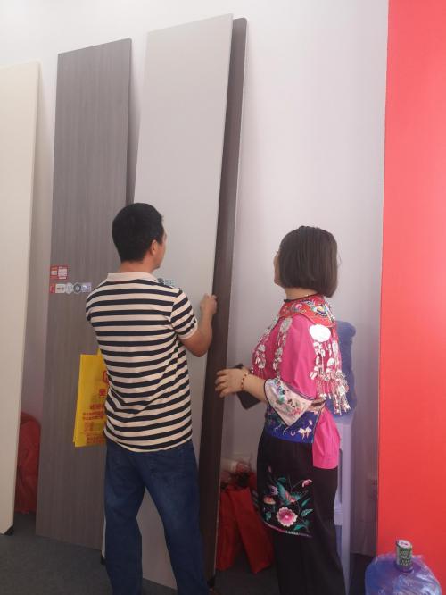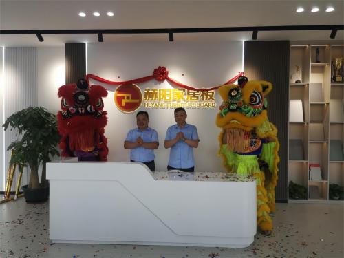 (展会客商(左)非常认真检验赫阳家居板) 7月19日,赫阳家居板迎来另外一件“大事”,那就是赫阳华南营销中心正式开业,这是赫阳家居板全国“五大中心”布局的重要一环。在欢快的鞭炮声和热烈的气氛中,赫阳家居板董事长周论兵亲手拉开幕布,也正式打开赫阳华南营销中心崭新的一页,全面开启赫阳家居板全国建设的序章。