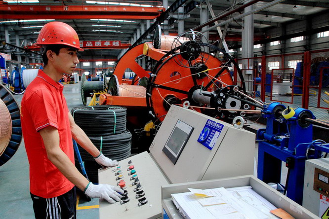 (参展企业新疆胡杨线缆制造有限公司正在加紧制作产品 / 新疆贸促会供图)