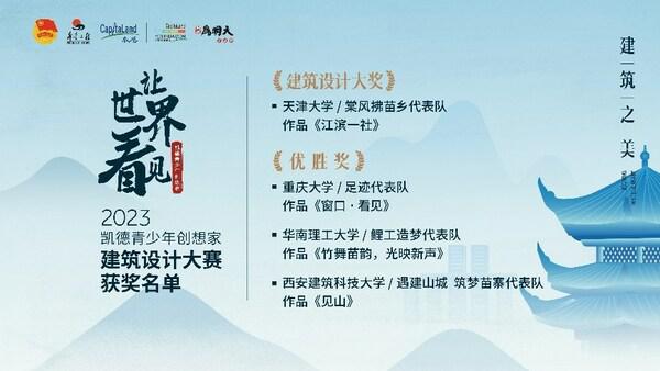 精彩"传承"之旅即将开启 10月19日,由凯德集团公益分支 -- 凯德希望基金支持的"让世界看见 -- 2023凯德青少年创想家"建筑设计大赛终期评审及颁奖仪式在重庆来福士奕桥Bridge+举行。国内四所知名高校建筑专业的学生团队历经近百天的考察探访、交流讨论,为重庆彭水郁山学校度身设计的特色建筑改造方案惊艳呈现。经专家评审会现场评定,天津大学的作品《江滨一社》获得"'让世界看见'建筑设计大奖"。 凯德青少年创想家“建筑之美”圆满收官 凯德地产(中国)首席执行官李绍强在颁奖典礼上向各位"青少年创想家"分享了凯德举办这次设计大赛的初衷,"作为一家负责任的企业,凯德一直致力于为业务所在地的环境和社会福祉做出贡献,为利益相关者创造长期经济价值,实现社会、企业、个人的可持续发展。社会在发展,我们的公益实践也与时俱进,今年的'凯德青少年创想家'公益项目,聚焦于'建筑'、'传承'、'乡村'三大主题,通过搭建平台,汇集各方力量,共同助力乡村振兴和民族文化传承。其中,在此次建筑设计大赛中,我们看到了青年学子的创新思维和新鲜力量,希望由此种下希望的种子,一方面激励大学生们学有所成,未来继续以可持续发展理念支持社区建设;另一方面,大学生们的精彩设计可以帮助到乡村教育,为乡村孩子们开启可持续未来。" 凯德地产(中国)首席执行官李绍强 重庆青基会理事长曾凯作为大赛的全程见证者,对此次活动的参与者和发起者都给予了肯定。"从大赛启动开始,我就一直关注着这群青年人。他们充满志向、专业过硬,展现了新时代青年的风采。而凯德这次的'青少年创想家'公益项目,恰好在城市青年成长与乡村发展之间,搭起了一座沟通的桥梁,彼此看见,给予支持,让乡村振兴落到了实处。" 高校学子,以创想力诠释建筑之美 建筑是历史与文化的承载者。凯德集团发起的2023凯德青少年创想家项目,意在通过可持续建筑大赛,为重庆彭水的郁山学校,提供一幢集多功能厅、民族文化传承及技能培训功能为一体的特色建筑改造设计解决方案,并结合专业技能及社会实践激发青年学子的创意及专业潜能。 自大赛7月16日启动后,参赛的四所高校 -- 西安建筑科技大学、天津大学、华南理工大学、重庆大学的建筑专业学生团队通过"2023凯德青少年创想家公益夏令营",深入彭水苗族土家族自治县采风,探访当地特色建筑、苗乡风情和历史文化,并进入郁山学校实地考察。此后,经过三个多月的探讨、深化、打磨,在凯德设计管理团队的支持下,各参赛队伍从建筑设计、文化传承、乡村振兴等多维视角出发,完成了4组设计改造方案及作品模型。 “让世界看见”建筑设计大奖作品效果图及四所高校参赛团队现场展示作品方案 由多位知名建筑设计师组成的专家评审团,从设计概念体现、在地文化特色融合、可持续发展理念的体现、造价把控等多个维度对4组作品进行了现场评审。 2023凯德青少年创想家建筑设计大赛获奖名单 获得建筑之美大赛"建筑设计大奖"的作品《江滨一社》是由天津大学团队带来,火塘式演讲厅的设计极具独创性,半开放的场地为建筑体未来的发展保留了可能性,整体方案精致、完整、严谨,生成逻辑清晰,在可行性和设计创新方面都具有潜力,赢得了现场评委及到场观众、媒体的一致肯定,实至名归。 其它优胜方案也各具特色。重庆大学的《窗口·看见》方案强调建筑自身表达力,注重对郁山传统文化的展现,绿建设计贯穿方案始终。华南理工大学的《竹舞苗韵,光映新声》方案以苗族传统舞蹈和银饰为灵感,成功将韵律感融入建筑外立面,造型轻盈,空间布置灵活。西安建筑科技大学的《见山》方案呈现出强烈的都市感,外立面幕布设计独具创意,圆窗在夜间营造的灯笼概念令人印象深刻。 凯德地产(中国)首席开发官卢子健作为大赛专家评审委员会主席,对参赛团队的专业能力表示肯定。"此次凯德发起的建筑设计大赛,成功搭建了一个多元平台,让青年一代的独特视角和创造力得到了充分彰显。我们从设计理念、外观形态、功能设置、结构考量等方面看到,每一个作品都凝结了参赛队伍的心力、脑力和创造力。希望青年建筑师们在未来继续发挥所长,用实践历练出来的创新思维和专业知识,为社会发展做出更多努力。" 凯德地产(中国)首席开发官卢子健 大赛另设"最佳人气奖",线上投票通道将于10月20日在凯德集团官方微信公众号开通,至11月30日截止。这些充满创想的设计方案及建筑模型,也将于今年底在重庆来福士购物中心开幕的"让世界看见"公益市集上率先与公众见面并接受现场投票,综合线上投票结果评出"最佳人气奖"。 结合公益的创新商业互动,让世界看见"传承之美" 接棒"建筑之美"建筑设计大赛,凯德以"创新"为核心出发点打造的"传承之美"主题活动将于11月正式亮相,依托在全国广泛的多元业态场景和线上线下商业生态网络,为公众提供一场前所未有的结合公益的互动体验。 凯德特别联动深山集市呈现的"让世界看见"公益市集将空降重庆来福士。这场以"让都市读懂大山、让未来读懂过去、让世界读懂中国、让世界看见"为轴线打造的市集,将重庆彭水当地苗族文化及产品带进购物中心,让城市居民也能沉浸式体验来自大山深处的美好。在市集上,由凯德联合专业文创团队打造的"彭友商店"AI公益文创品牌、重庆大学和