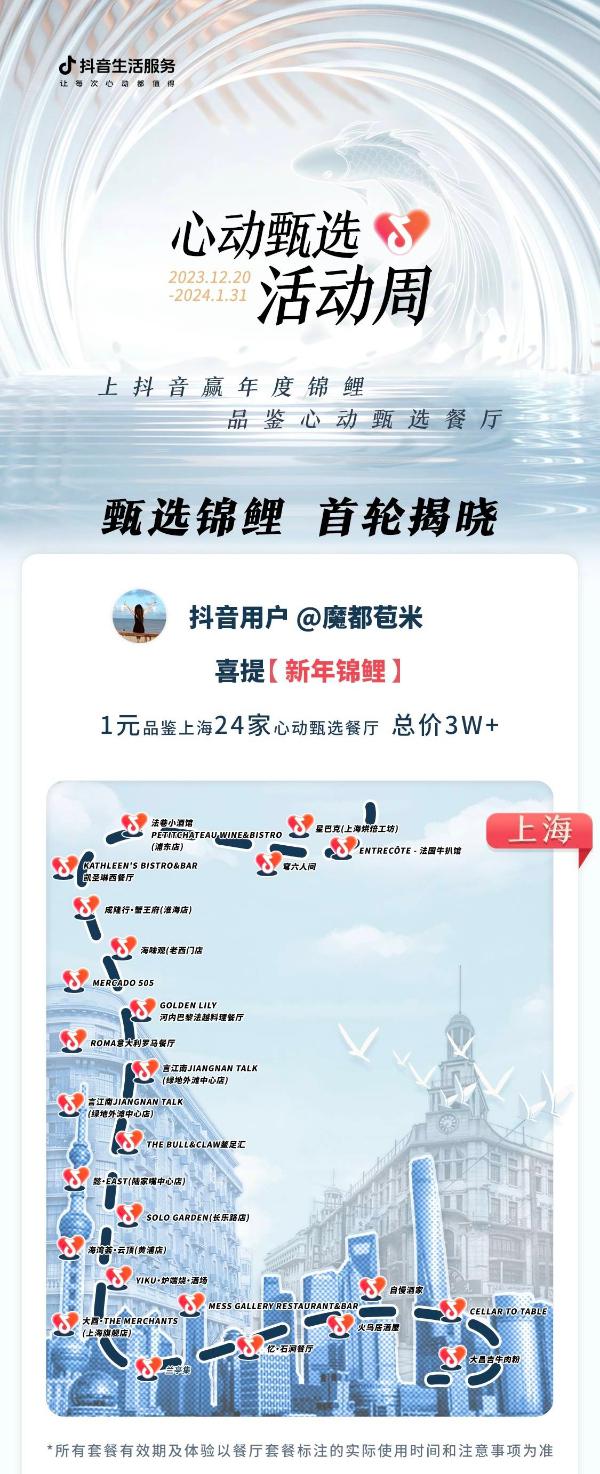 烟火人间,品舌尖之悦,依赖国人对美食的厚爱,一餐美味足以激荡心尖的波澜。一些关于美食的小幸运,熨帖着我们对生活每时每刻的喜悦与期待。 过去的2023年,我们从爱人手中接过秋天的第一杯奶茶,品味茶饮之甜蜜;我们与家人欢聚品一餐美味的水饺,守护冬至的团圆仪式感;我们奔赴一场闺蜜好友间盛装款款的美味之约,在平安夜守候到属于自己的苹果;我们在跨年夜点亮粲然烟火,在皑皑冬夜,品尝美味,寄语新年期待。凡此收获内心喜悦与平和的烟火瞬间,汇聚起我们的2023心动时刻。 生活小确幸的发生,有美食相伴,然不止在舌尖,也在家人、密友、爱侣、伙伴之间。与爱相聚,佐美食为伴的心动故事,成就了我们愿为之以镜头记录珍藏的人生瞬间,终将沉淀为我们的人生心动日历。 在2024开年之际,抖音生活服务也送出了新年的第一个心动时刻。12月20日起发起的「心动甄选活动周」活动,截至今日,已诞生首个幸运锦鲤,畅享「所在城市心动甄选餐厅套餐 尽可1元解锁」的心动福利。 01 新年锦鲤首轮揭晓,解锁上海24家心动甄选餐厅套餐此前,抖音生活服务针对当前餐饮行业环境及消费者就餐需求变化情况,推出「抖音心动甄选餐厅」年度榜单,为向往美好生活的用户,打造愿意吃、吃得起的“精品餐饮风向标”,成为帮用户“选餐厅的伙伴”。 伴随着2024「抖音心动甄选餐厅」的推出,自12月20日起,抖音生活服务也为广大爱吃、会吃的抖音用户推出「心动甄选活动周」活动,并送出“心动甄选年度锦鲤”与“心动甄选盲盒小确幸”惊喜福利,鼓励大家记录并分享#心动甄选惊喜食刻 故事。 截至1月5日,已有1位幸运锦鲤诞生,来自上海的抖音创作者@魔都苞米 探店上海心动甄选餐厅【Entrecôte - 法国牛扒馆】的优质VLOG,赢取「心动甄选活动周」首轮锦鲤——【新年锦鲤】福利,成功解锁总价3万+的24家心动甄选餐厅套餐美食福利。 新年首周即赢取年度锦鲤好运,这位幸运小伙伴,必将迎接好运满满的一年! 02 心动甄选福利继续,邀你赢取年度锦鲤与盲盒好运抖音生活服务「心动甄选活动周」活动,锦鲤好运持续发放中。即日起至1月31日,覆盖北京、上海、广州、深圳、成都、杭州、苏州、西安、武汉、长沙、南京、天津、宁波、青岛等14个城市的170多家抖音心动甄选上榜餐厅,任选打卡其中一家,在品鉴心动美食的同时,完成三个步骤,仍可参与抖音“心动甄选年度锦鲤”活动! 活动将分别在1月18日、2月2日,从视频内容的话题贴合度&视频播放量综合排名前20的参与用户中,继续抽选出【大发锦鲤】【迎新锦鲤】各一人。 越用心,越幸运,参赛规则请查收:第一步,到店打卡&收藏「抖音心动甄选餐厅」,打卡1家即符合参赛要求;第二步,定位上榜餐厅并带话题#心动甄选惊喜食刻 发布真情实感探店VLOG;第三步,进入排名前20的参赛用户,抖音生活服务官方将通过抖音私信推送抽奖链接,用户 年度锦鲤仅剩2次赢取机会,担心自己错过福利?抖音生活服务还加码送出盲盒小确幸: 即日起至1月31日,「心动甄选活动周」限量发放“心动甄选盲盒”,送出满300元减58元礼金、满500元减88元礼金的心动甄选礼金,参赛用户还有机会1元赢取心动甄选寻味游,品鉴所在上榜城市3顿心动甄选套餐。14城盲盒1元解锁,心动选手抓紧报名,也许下一个幸运锦鲤就是你! 抖音生活服务「心动甄选活动周」锦鲤福利心动加载中,抖音搜索【心动甄选惊喜食刻】进入话题页,品鉴心动甄选餐厅,拉满新年聚餐仪式感的同时,用镜头记录分享心动食刻,抢赢年度锦鲤与城市盲盒福利,在开年首月积攒满满好运吧! 中国首席商业资讯门户;更多内容请关注中国商业网各频道、栏目资讯。 免责声明:凡未注明来自本站的稿件和图片作品,系转载自其它网站,转载目的在于信息传递,并不代表本站赞同其观点和对其真实性负责 。 |