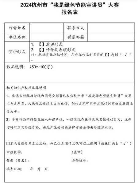 生态环境没有替代品 用之不觉,失之难存 节能低碳是时代趋势 这不仅是一种选择,更是一种责任 每一次减碳,就是对未来的一种投资 新青年,不“碳”气 为深入贯彻生态文明思想,倡导简约适度、绿色低碳的生活与工作方式,促进社会大众争做能源资源节约和生态环境保护的倡导者、行动者、示范者,充分发挥公共机构助力杭州市实现碳达峰目标的示范引领作用,由杭州市机关事务管理局、杭州市发展和改革委员会主办的“2024杭州市‘我是绿色节能宣讲员’大赛”现火热开启,诚邀您参加本次活动,一同争当低碳生活的行动者、宣传者、监督者,共同践行绿色低碳生活方式,节约能源资源,让绿色成为生活底色,让低碳成为生活习惯! 01 征集时间 2024年4月15日—2024年5月15日 02 活动主题 我是绿色节能宣讲员 03 组织单位 主办单位 杭州市机关事务管理局 杭州市发展和改革委员会 承办单位 杭州临空建投文化传媒有限公司 04 宣讲内容 以节能降碳为主题,以传播绿色发展为宗旨,以各类资源节约集约利用、绿色低碳发展、生态文明建设为重点,展现节能降碳在推动实现碳达峰碳中和目标、全面建设社会主义现代化国家、促进中华民族永续发展等方面的重要作用,小切口大展面地讲好节能故事、传播节能理念、普及节能知识,推动形成绿色低碳的社会风尚。 本次征集活动拒绝任何与党的路线、方针、政策和国家法律法规相抵触的作品;作品必须为原创,突出作品的真实性、生动性和艺术性等效果。 05 宣讲形式 演讲形式或情景剧表演形式。 06 征集要求 1、宣讲内容以视频的格式报送,作品时长控制在5分钟左右,微视频格式为MP4,影像清晰,画面质量不低于1080P,大小限制在1G以内。可根据需要制作片头、片尾,片头注明宣讲主题、宣讲人,片尾可注明出品单位、主创团队和个人,但不得添加水印标志,不得插入商业广告。 2、参赛作品必须为2024年1月以来原创的、未参赛作品,著作者拥有独立、完整著作权,参赛者提交作品时必须同时提交原创承诺书,参赛作品不得侵犯他人知识产权,一经发现存在抄袭或其他侵权行为,主办方将取消其参选资格,由此产生的相关法律责任全部由参选方承担,主办方不承担因肖像权、名誉权、隐私权、著作权、商标权等纠纷产生的法律责任。作品征集评选不收评审费、不退稿,投稿即默认允许作品在各类展示平台展示。参赛作品入围或获奖,主办方有权对入围作品在各类媒体平台播放和开发使用。 07 征集方式 参赛作品和报名表统一在2024年5月15日24:00前发送至官方征集邮箱 18058781997@163.com,并注明“2024杭州市‘我是绿色节能宣讲员’大赛投稿”,截稿时间以邮件发送时间为准,邮件标题须注明“作品名称+作者姓名+联系方式(手机号码)”。无相关资料的投稿作品,主办单位有权取消其参评资格。 08 奖项设置 演讲类: 一等奖1组 奖金3000+荣誉证书 二等奖2组 奖金2000+荣誉证书 三等奖3组 奖金1000+荣誉证书 网络人气奖 1组 奖金1000+荣誉证书 情景剧表演类: 一等奖1组 奖金4000+荣誉证书 二等奖2组 奖金3000+荣誉证书 三等奖3组 奖金2000+荣誉证书 网络人气奖 1组 奖金1000+荣誉证书 其它奖项: 最佳组织奖 1组 奖金2000+荣誉证书 入围奖若干 奖品+荣誉证书 09 评审流程 1、作品初审:主办单位将组织相关单位代表和专业人员成立专家评审委员会,对作品进行初审。专家评审委员将根据演讲内容、语言表达、演讲感染力、形象风度等维度,挑选出若干符合征集要求的作品。 2、网络投票:通过初审的作品将发布在官方指定投票平台。主办方将依据投票数评选出网络人气奖各1名。(投票通道及投票要求届时另行通知) 3、现场评比:按照网络占30%,专家占70%的比值,分别综合评定出演讲和情景剧表演前六名作品,进入决赛。决赛将采用现场评比的形式。(决赛具体时间及流程届时另行通知) 10 专家阵容 将设置5名专家评审委员,由学者、艺术家、节能专家等共同组成。 联系人:临空建投文化传媒 联系方式:0571-82110320 18058781997 中国首席商业资讯门户;更多内容请关注中国商业网各频道、栏目资讯。 免责声明:凡未注明来自本站的稿件和图片作品,系转载自其它网站,转载目的在于信息传递,并不代表本站赞同其观点和对其真实性负责 。 |