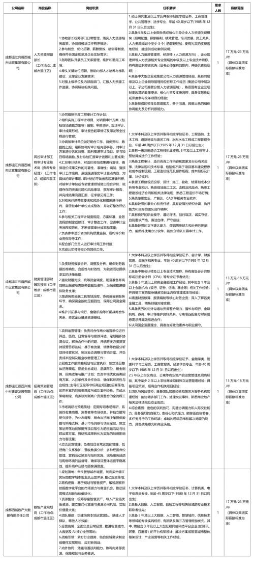 2026年开年之际,成都市温江区释放23个#国有企业#专业化及中层管理#岗位#,推动人才引进从“基础配置”向“战略引领”转变,构建“产业聚才、人才强企”的良性循环生态。 本次#招聘#聚焦大数据、人工智能、电子信息、智能制造、医药健康等新兴产业领域,4家区属国企靶向发布“产业投资负责人”“数智产业规划岗”等23个急需紧缺岗位,涵盖产业投资、数智规划、园区运营、风控合规、财务管理、工程管理、医药健康等多元方向,薪酬待遇对标市场化水平,部分岗位年薪可达45万元,配套“五险一金”、绩效奖金、各类补贴等完善福利。 附:国企招聘岗位 成都温江兴蓉西城市运营集团有限公司