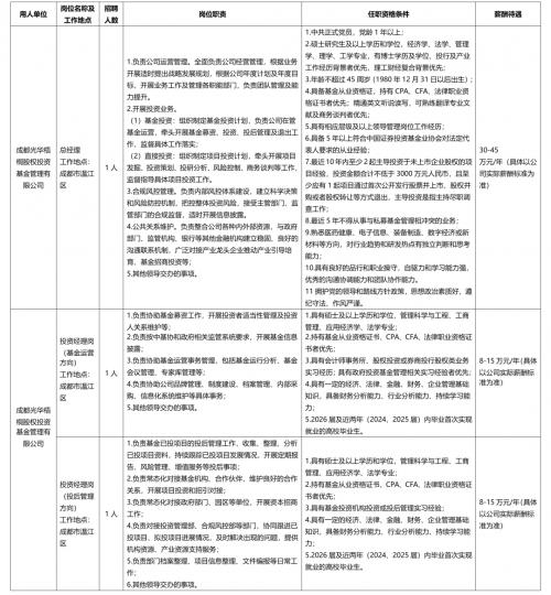 原文招聘公告(链接:cdlktzjt.cn/index.php/szdetail/index?postId=608846917949676948317&dataDictionaryId=205625336283647969024&dataDictionaryItemId=206558511758935854797) ·咨询电话·招聘服务:028-82743200(工作日9:00-17:00)行政人力部:028-82627776(工作日9:00-17:00) 成都光华开源资本管理有限责任公司
