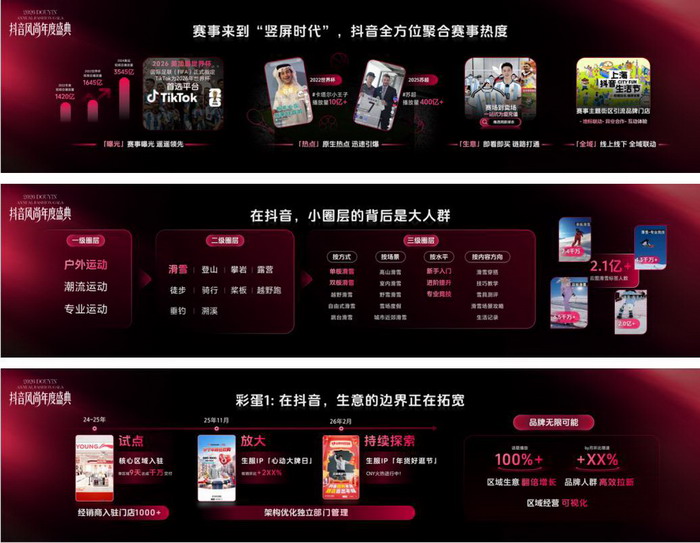 当“趋势”的诞生从传统的时尚界,转向海量用户的真实喜好与共创,抖音作为关键“连接器”,其平台价值在1月22日的风尚年终盛典上被具象呈现。 盛典上,开场大秀《美·生万物》以未来视角回望,“美” 从无标准答案,而是在抖音生态中被持续追溯、体验与共创的流动过程。而盛典压轴环节,“至尚奖”正式发布,共有29个品牌、17款单品与2位行业人物获奖,这些行业标杆集中呈现了服饰行业从趋势洞察到生意增长的全链路实践。从国际专业品牌到国货领军者,获奖单位凭借卓越的产品创新力、深度种草力与全域经营力,在内容营销、场景破圈及整合增长等多维度树立了年度标杆。 01 平台策略发布:营销一体化MAX 3.0,从价值共创到增长共启 当服饰行业的增长日益依赖与用户情绪的深度共鸣与圈层的高效连接,平台的角色正从流量场域升维为品牌长效经营的战略伙伴。巨量引擎表示,“服饰营销已迈入‘营销一体化MAX 3.0’新阶段”。 其核心是让品牌主的每一分投入都更值得,实现从“品牌焕新”到“利润下的量价齐飞”。 为承接这一战略蓝图,“营销一体化MAX 3.0”进一步阐释了如何让“好内容”这一品牌穿越周期的记忆载体,直接驱动生意增长。平台以现象级案例证明,一则引发全民情感共鸣的优质内容,能为品牌带来超5亿播放、20万+品牌号增粉及29%的品牌词搜索量提升,验证了“蝴蝶振翅”般的内容长效价值。 “营销一体化MAX 3.0”的实践,具体落位于三大协同升级的场域:在 “大事件,在大平台” 层面,抖音通过赛事、秀场、明星生态等资源,让品牌大事件深度融入用户全场景生活;以 “小圈层,大杠杆” 为路径,借助AI与数据能力将宏观兴趣细分为可运营的微观场景,通过沉浸式圈层运营高效撬动品牌心智与生意;并以 AI技术驱动全域提效,通过“星图AI Agent”等工具将内容策略与生产周期从数天缩短至小时级,实现规模化精准沟通。这些能力最终汇聚为以抖音为全域经营主阵地的增长飞轮——通过内容场激发兴趣、塑造心智,驱动线上即时转化与线下协同增长,构建品效合一、线上线下联动的增长新蓝图。 最终,这些能力汇聚为清晰的“抖音服饰增长模型”:以抖音为全域经营主阵地,通过内容场激发兴趣、塑造心智,驱动线上直播与货架电商的即时转化,并协同线下体验与跨平台增长,构建品效合一、线上线下联动的增长飞轮,共绘增长新蓝图。 02 行业思维交锋:从细分场景到大众共识的品牌跃迁 平台策略勾勒出增长蓝图,而现场的思维交锋则指明了抵达的路径。在《风·焕新象》圆桌对话中,抖音创作者陈采尼CheneyChan提出的 “活人感”,点破了有效沟通的核心——内容必须生长于具体的“人群×场景”之中。抖音持续通过精细化的标签体系与垂类运营,正系统化地构建一座连接品牌与无数圈层创作者的“超级桥梁”,让这种基于真实场景的对话得以规模化实现。 当基于人群的沟通成为可能,营销的范式便被重新书写。新营销智库刀法Digipont创始人刀姐doris提出了一个关键的战略判断:服饰营销已进入“抖音时代”。其平台的核心价值在于,它既能像海纳百川,汇聚起无数细分的兴趣社群;又能将多元的审美趋势,锻造为引领大众的消费共识。这为品牌构建了一条从精准渗透到广泛引领的完整跃迁通道。 03 至尚奖发布:致敬标杆,定义增长新高度 策略指引方向,共识凝聚路径,而最终验证一切的,是实打实的商业成果与标杆实践。“至尚奖” 依托真实用户数据与消费者反馈,从营销创新、产品表现及行业影响力三大维度,系统评选出在过去一年中兼具前瞻性与实践价值的品牌、产品与人物典范。 具体奖项体系全面衡量了生态内综合表现。“年度优质种草品牌”、“年度营销典范品牌”与“年度全域经营品牌”,分别对应内容心智渗透、品效协同创新与线上线下全域增长的核心能力;“年度服饰爆品”与“年度服饰新品”,聚焦于在销售、口碑与创新上均领跑市场的年度单品;“年度至尚品牌”与“年度至尚人物”,则旨在致敬以前瞻思维与卓越行动,深刻影响行业格局的开拓者。