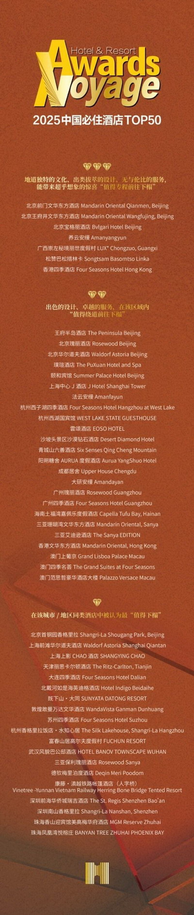 历经风浪,方见新岸。 当下,中国酒店业正经历一场由消费分层、技术革命与全球化竞争共同驱动的深刻变革。在变局中锚定价值,于创新中重构体验,成为行业共同的时代命题。 在此背景下,2025第17届Voyage酒店大奖暨第10届中国必住酒店TOP50榜单如期而至。 历经半年的广泛征集、专业评审与深入研讨,我们试图在纷繁变化中,寻觅那些真正定义未来、重塑格局的锚点。 今年的候选者,或是以卓越设计重释在地文化,成为城市的精神客厅;或是以超前理念打破空间边界,创造复合式生活场域;或是以极致细节与人性关怀,让停留本身成为一种深刻的旅行。 我们相信,真正卓越的酒店,不仅是时代的见证者,更应是趋势的创造者与价值的守护者。它们在最根本的"宿"与"居"之上,构建出超越功能的情感连接与意义共鸣。 此刻,榜单揭晓。让我们一起,见证这场关于旅居未来的重新定义,并期待这些杰出的身影,如何照亮行业前行的航路。 点击查看第17届Voyage酒店大奖暨中国必住酒店TOP50榜单 或访问新旅行网站查看更多信息:xinlvxing.com.cn 中国首席商业资讯门户;更多内容请关注中国商业网各频道、栏目资讯。 免责声明:凡未注明来自本站的稿件和图片作品,系转载自其它网站,转载目的在于信息传递,并不代表本站赞同其观点和对其真实性负责 。 |